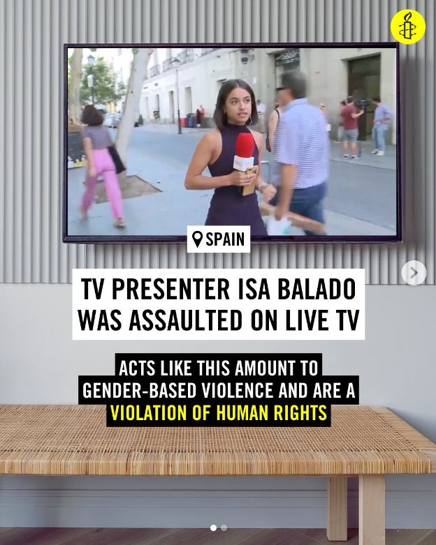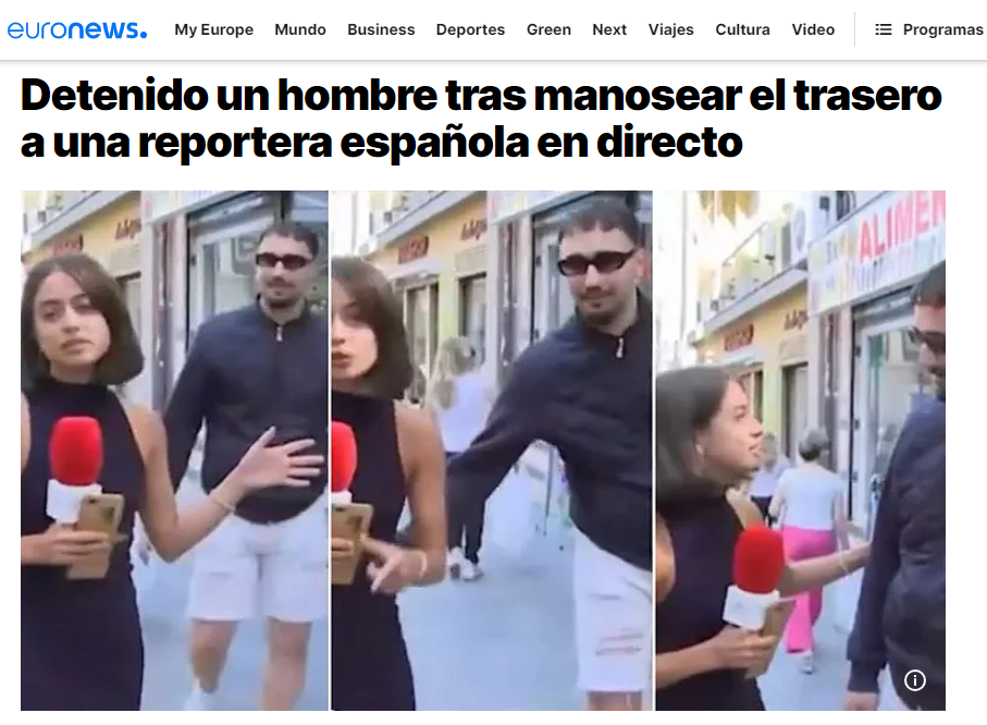 Le 12 septembre, lors de l’émission En Boca de Todos (Tout le Monde en Parle) de la chaîne espagnole Cuatro, la journaliste Isa Balado s’exprimait en extérieur face caméra. Arrivant par derrière, un homme lui a demandé pour quelle chaîne elle travaillait – mais non sans lui avoir, devant la caméra, touché les fesses.