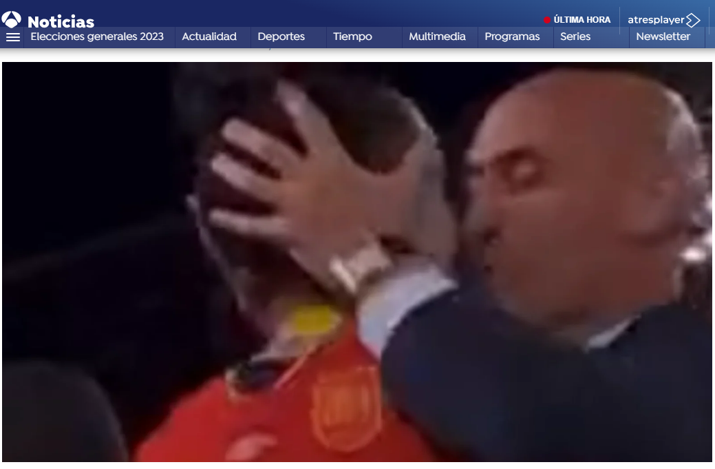 Le 20 août, à l’issue du match remporté par l’Espagne, Luis Rubiales, Président de la Royale Fédération espagnole de Football (FREF), vient féliciter l’attaquante Jenni Hermoso mais, sans demander la permission ni y être invité, lui agrippe l’entrejambes et l’embrasse sur les lèvres. La footballeuse confirme n’avoir jamais donné son consentement, ce qui fait du baiser forcé de Luis Rubiales une agression sexuelle.