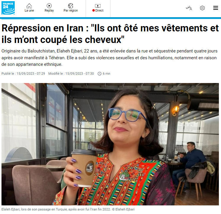 Une autre jeune femme issue d’une minorité ethnique, Elaheh Ejbari, âgée de vingt-deux ans, a récemment attiré l’attention en subissant des tortures qui ont manqué de faire d’elle une nouvelle Mahsa Amini. Elaheh Ejbari, qui est baloutche, avait fui son Sistan-Baloutchistan d’origine aux traditions patriarcales archaïques pour Téhéran où elle avait manifesté après le meurtre de Mahsa Amini. Elle y gagnait sa vie en dispensant des cours particuliers de langues.