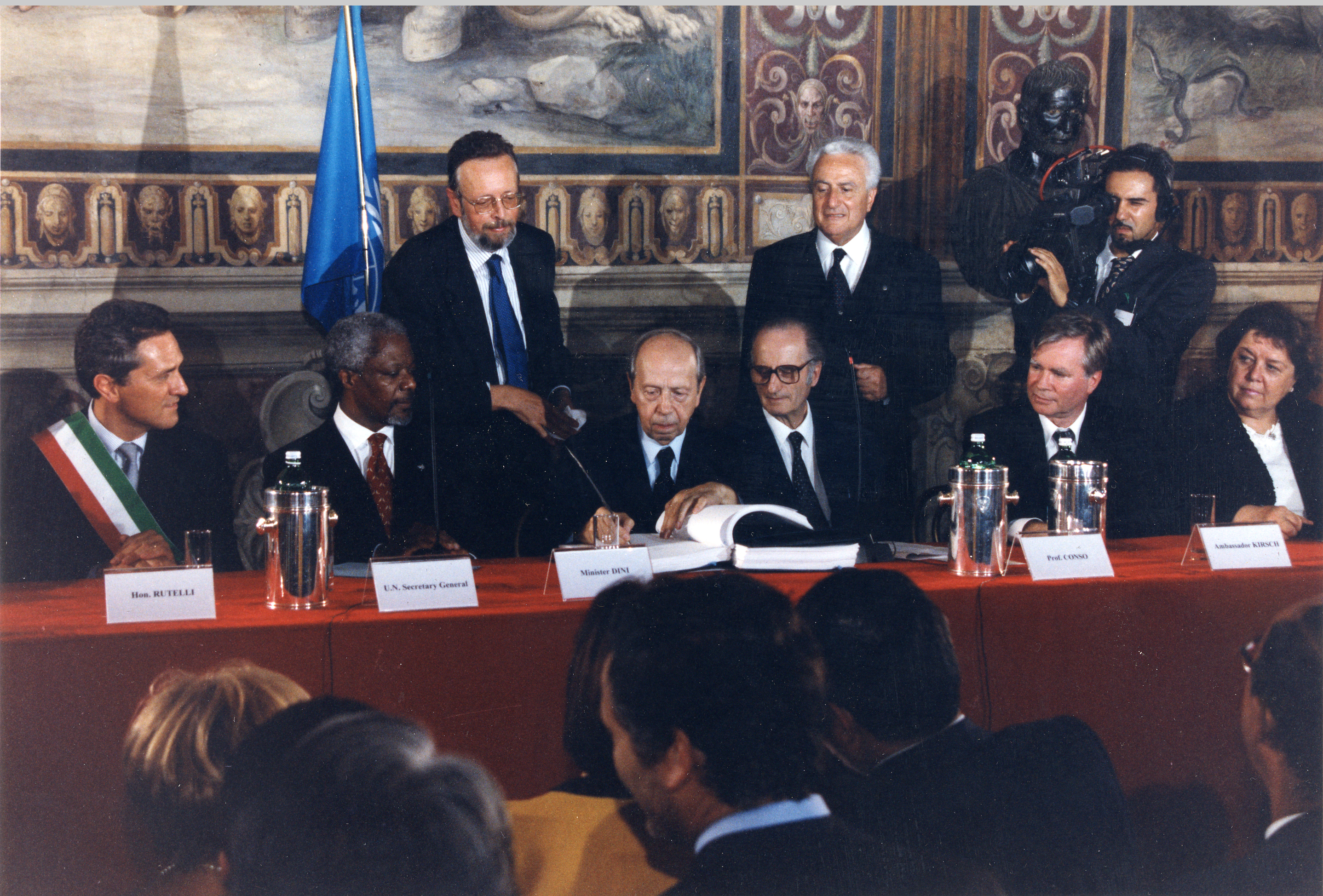 Lamberto Dini, Président du Conseil de la République italienne, signe le Statut de la CPI lors de la Conférence diplomatique de Rome. (C) Nations Unies