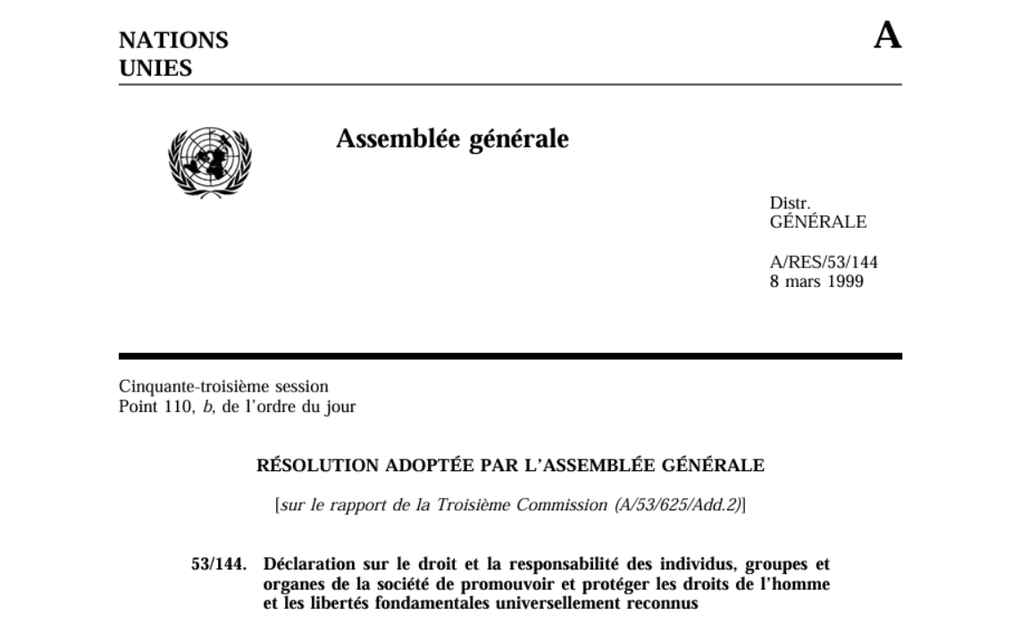 Née le 9 décembre 1998, soit un demi-siècle après la DUDH, à l’Assemblée générale des Nations Unies alors installée déjà de longue date en ses locaux attitrés de New York, elle porte un nom d’état-civil barbare : «Déclaration sur le droit et la responsabilité des individus, groupes et organes de la société de promouvoir et protéger les droits de l’homme et les libertés fondamentales universellement reconnus». Mais pour l’ONU elle-même, pour les juristes internationaux et pour les gens auxquels elle se destine, ces gens qui font partie de son nom même, elle s’appelle la Déclaration sur les Défenseurs des Droits de l’Homme (DDDH).