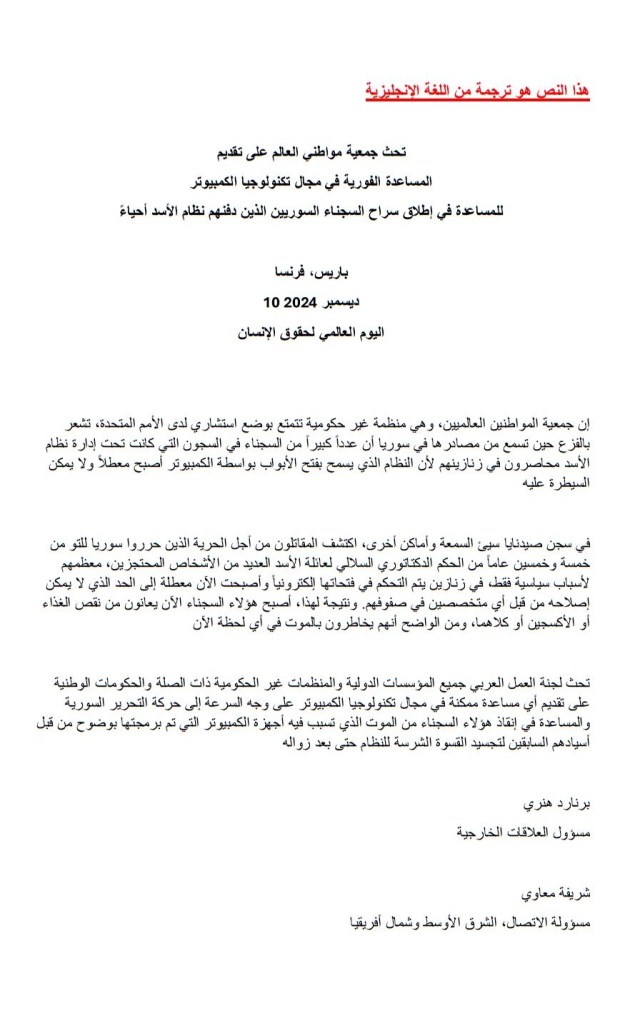 THE ASSOCIATION OF WORLD CITIZENS URGES IMMEDIATE ASSISTANCE IN COMPUTER TECHNOLOGY TO HELP FREE SYRIA’S INMATES BURIED ALIVE BY THE ASSAD REGIME