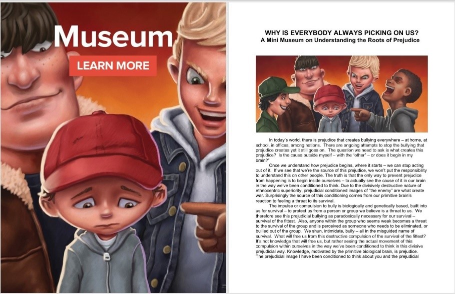 A two-page spread of the book Museum: Learn More. Why is Everybody Always Picking on Us? A Mini Museum on Understanding the Roots of Prejudice (English Edition, Atrium Society Publications, USA, 2019. – 75 p.)