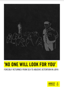 In a newly released report entitled ‘No One Will Look for You’: Forcibly Returned from Sea to Abusive Detention in Libya, Amnesty International explains how “men, women and children intercepted while crossing the Mediterranean Sea and forcibly returned to detention centers in Libya” get subjected to an array of human rights violations in detention centers, such as “torture and other ill-treatment, cruel and inhuman detention conditions, extortion and forced labor” as well as “invasive, humiliating and violent strip-searches”, when not rape.