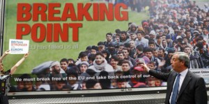Nigel Farage, chef du parti UKIP, agitant le spectre de la migration pour amener les Britanniques à voter pour le Brexit en 2016 (C) @epkaufm (Twitter), licensed under Public Domain