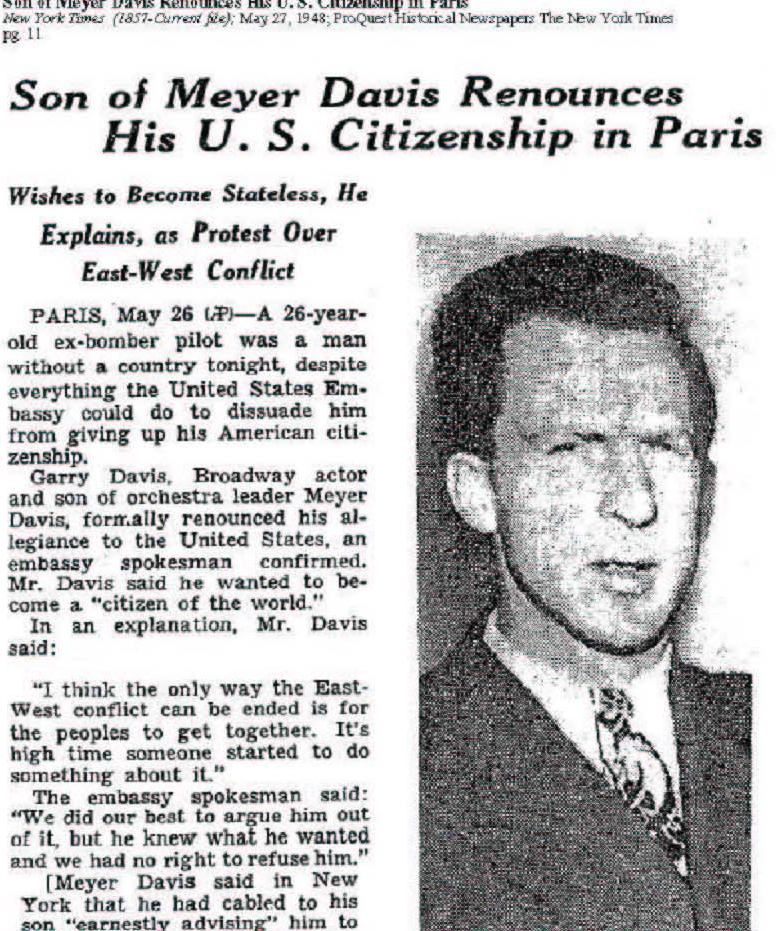 Garry Davis, born in 1921, was a young Broadway actor in New York prior to the entry of the U. S. in the World War in 1941. Garry Davis was a son of Meyer Davis, a well-known popular band leader who often performed at society balls and was well known in the New York-based entertainment world. Thus, it was fairly natural that his son would enter the entertainment world, as a “song and dance” actor in the musical comedies of those days. Garry had studied at the Carnegie Institute of Technology, a leading technology institution.